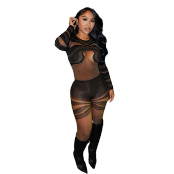 Sıcak satış kadın seksi rahat yaz nefes Backless baskılı şeffaf ağ tam boy tulum