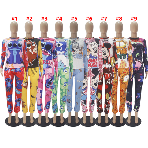 Baskılı uzun kollu uzun pantolon iki parçalı Set karikatür pijama ev giyim kadın pijama seti